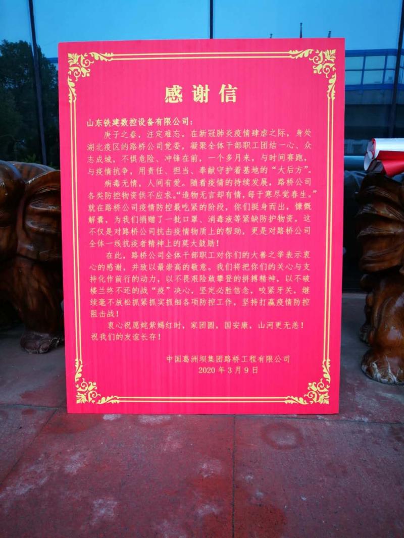 充分发挥桥梁纽带作用,同心抗“疫”。作为一个有责任、有担当的爱心企业,山东铁建数控设备有限公司,响应国家号召,尽企业微薄之力,向湖北捐献物资,为抗疫工作添一份力量、尽一份责任、献一份爱心。